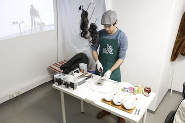 During the opening and screening of Work/The Work, Aman Askarizad performed with his hair archive collected from 2012 onward, where he baked cookies and served them to visitors with different tastes of toppings made with his hair. Audiences could choose which year hair and what type of garnish they want on their cookies. They also had the option to take a cookie without the artist's hair. Working hours were 17:00-20:00.